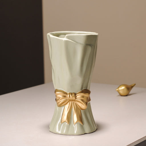 Green Elegant Ceramic Vase with Golden Bow Accent - Textured Relief Flower Holder for Living Room & Dining Table Decor